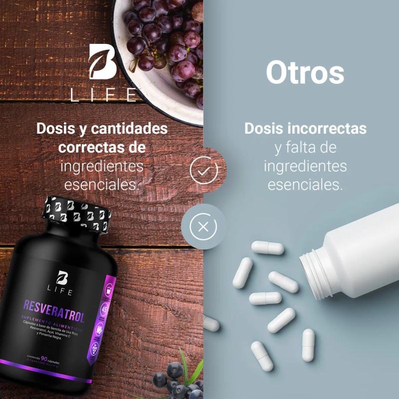 ¡Resveratrol B Life, un poderoso antioxidante! Cada cápsula de 500 mg contiene una formulación especial a base de Resveratrol, Semillas de Uva Roja, Açaí, Vitamina C, enriquecida con Pimienta Negra. Esta sinergia potencia la absorción de nutrientes, optimizando la eficacia de los activos, una ventaja que otras presentaciones no contienen. Contiene 90 cápsulas.