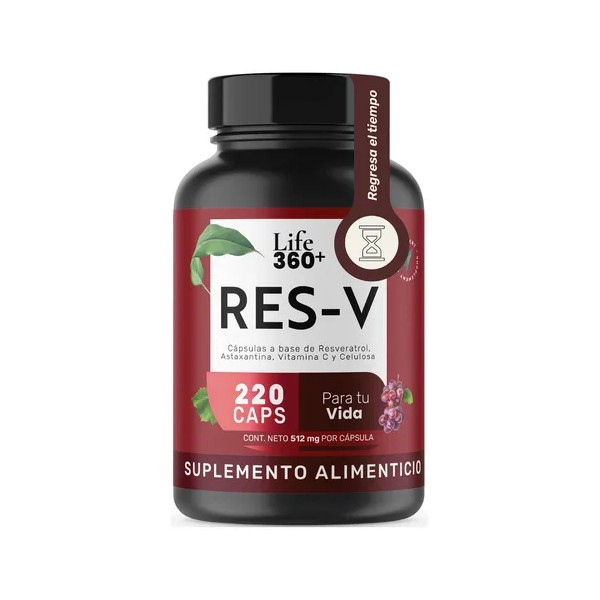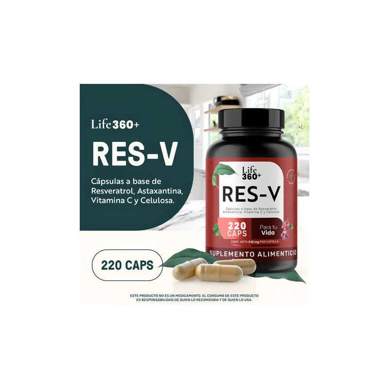 PRESENTACIÓN: LIFE360+ Res-V es un suplemento alimenticio en cápsulas a base de resveratrol, astaxantina, vitamina C y celulosa que se encuentra disponible en presentación de envase de tarro de plástico con un contenido neto de 220 cápsulas.