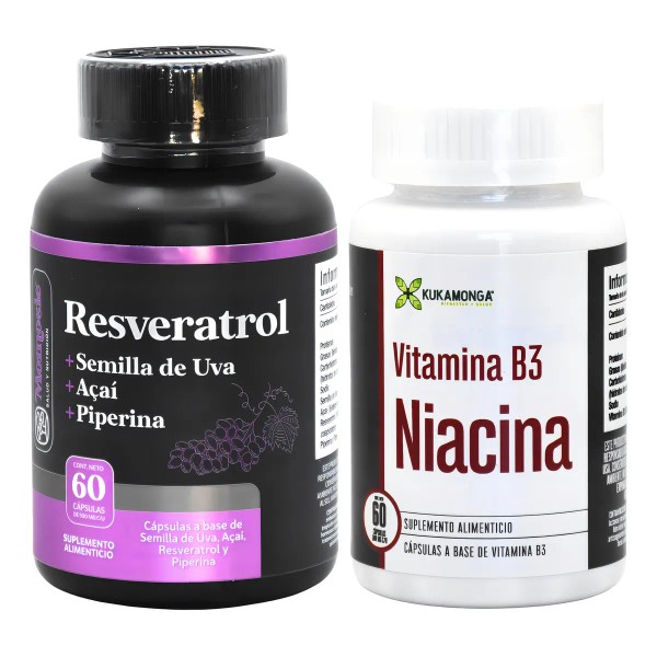 - Este combo une dos ingredientes naturales clave para el apoyo del metabolismo energético y el bienestar celular. El Resveratrol, un compuesto presente en la uva, ha sido objeto de estudio por su potencial en la protección contra el estrés oxidativo. La Niacina (vitamina B3) participa en procesos metabólicos esenciales para la producción de energía celular y el funcionamiento del sistema nervioso. Beneficios potenciales: Apoyo antioxidante y anti