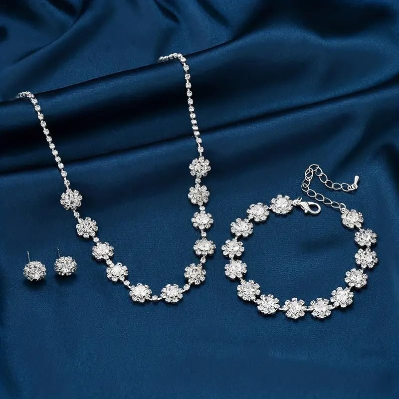 Resweky 3Pcs Wedding Necklace Earrings Sets Silver Rhinestone Bridal Flower Pendant Necklace Bridal Jewelry Set Wedding Accessories for Women