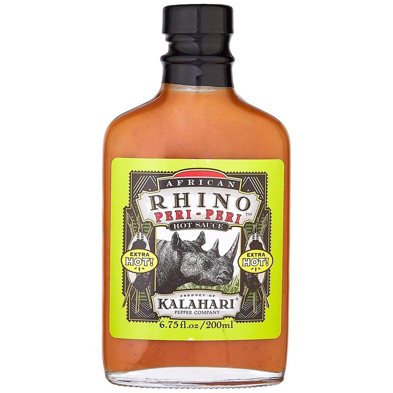 African Rhino Peri-Peri "Extra Hot" Pepper Sauce - This will run you down and stick its horn in ya like the wild beast Rhino. The exotic Peri-Peri is Africa's hottest chili pepper. Strains from Botswana and Mozambique are grown exclusively for the Kalahari Pepper Company so you, too, can experience the soul of Africa's "Great Thirstland," the Kalahari Desert. This sauce is great on all meats, seafood, poultry and vegetable dishes.From AlabamaIngredients: Roasted tomatoes, onion, cider vinegar, lemon juice, Peri-Peri chili peppers, canola oil, roasted garlic, sugar, salt & spices.
