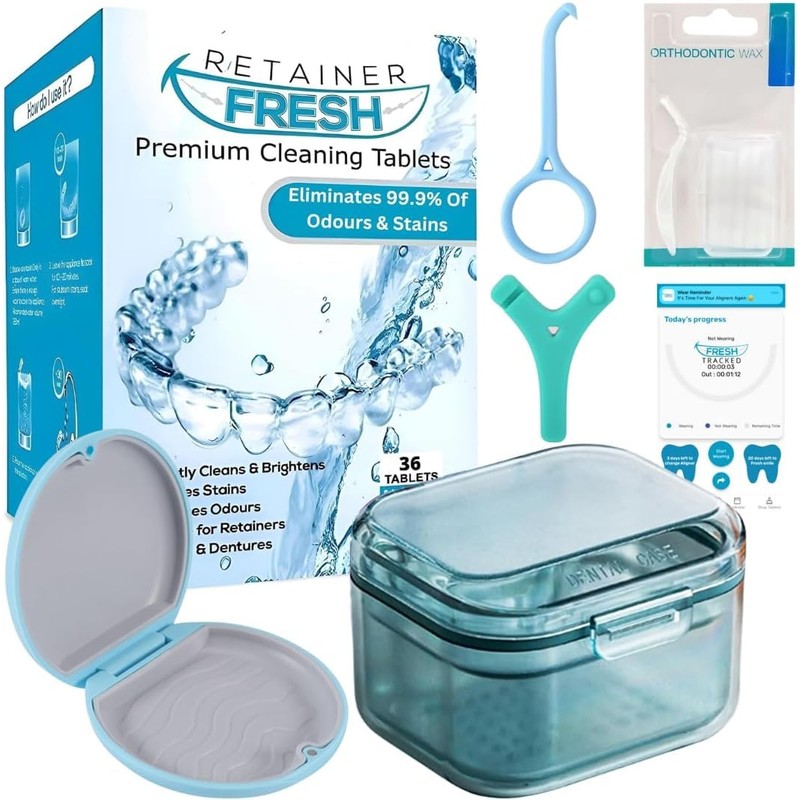 - ?? WHAT IS INCLUDED - Retainer Fresh Retainer Cleaning Tablets, Retainer Box, Retainer Case, Ortho Wax, Aligner Chewies, Aligner Removal Tool, Fresh Tracked App