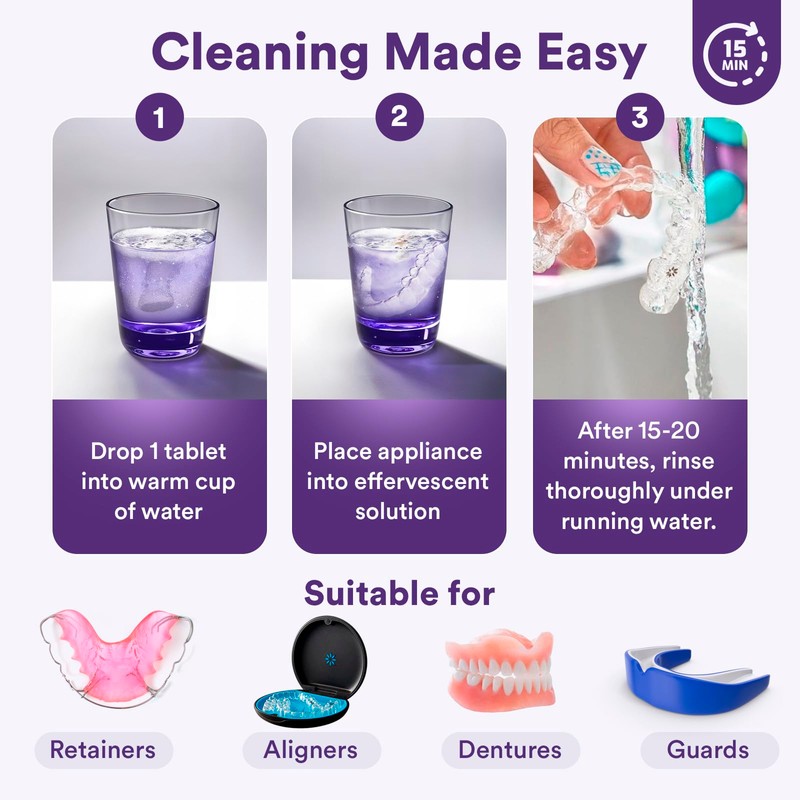 - -1 MONTH DAILY SUPPLY- Brushing your teeth daily is essential, so cleaning your dental appliance should be too. B.WEISS Purple tablets come in a pack of 30 for daily use, ensuring your appliance stays clean from grime and plaque. Just 15 minutes a day keeps your appliance sanitized.