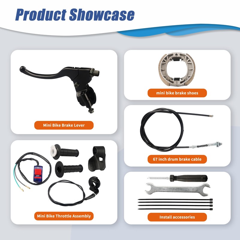 - Products Included:1 x black 22mm 7/8" throttle assembly handle grip,1 x black mini bike throttle cable,1 x 22 mm brake lever handle,1 x black 67 inch mini bike drum brake cable,1 x 105 mm mini bike brake shoes,1 x black Throttle Clip,1 x Screwdriver,1 x Wrench ,4 x Ties