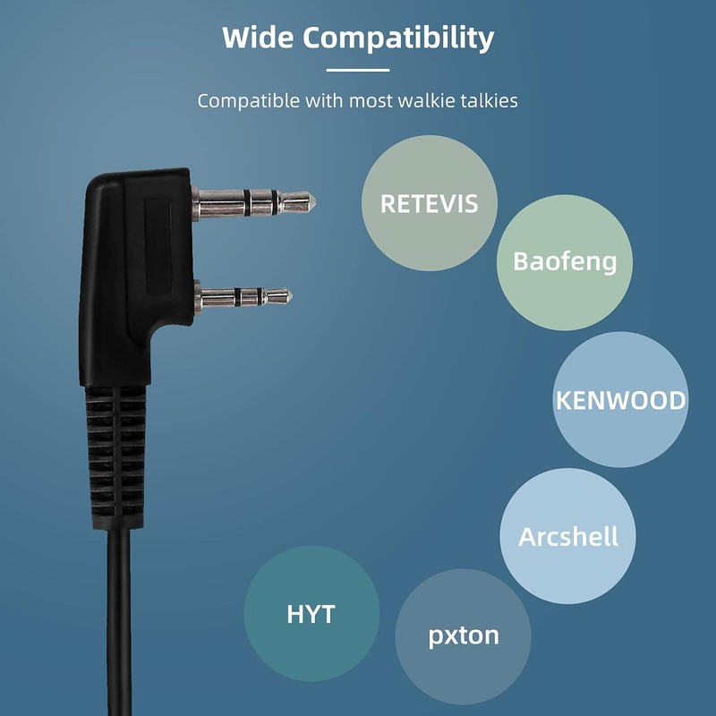 - Kenwood 2 pin; widely compatible with most 2 way radio models; such as Retevis RT22 RT21 H-777 RT68 RT19 walkie talkies; etc