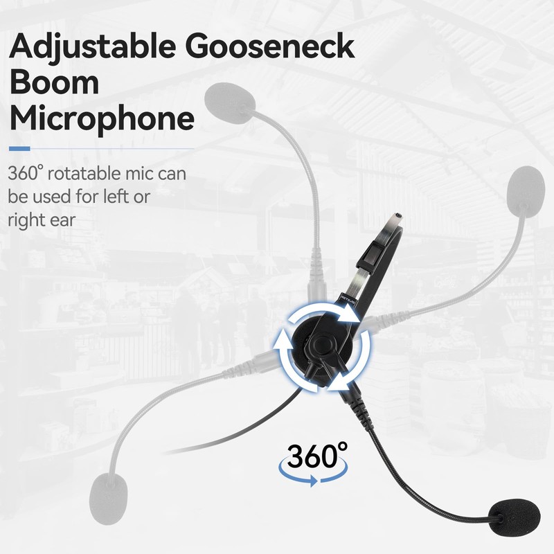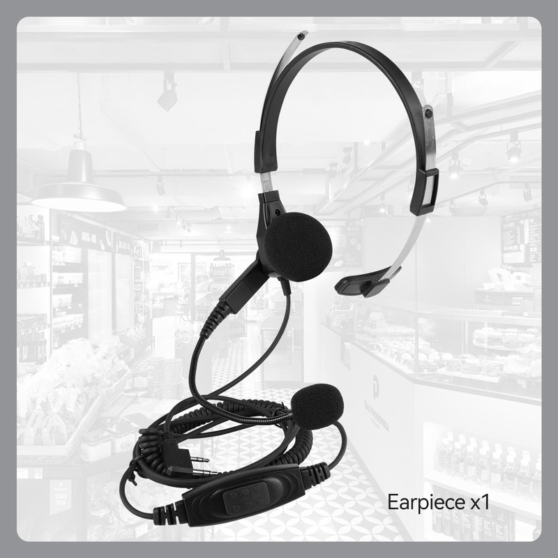 - 360° rotatable overhead walkie talkie headset; allows users to wear on the left or right ear; increasing the flexibility of use