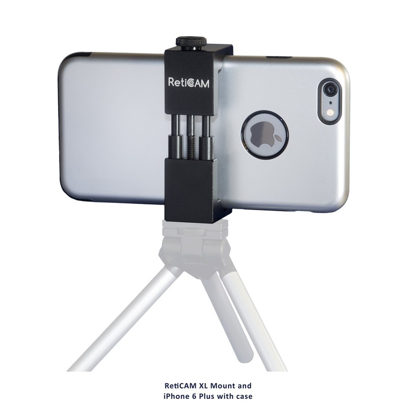 RetiCAM Smartphone Tripod Mounts are precision CNC machined from solid aluminum and finished with hard anodizing for exceptional strength and rust/scratch resistance. We offer two versions: Standard Size and XL Size. The XL model can hold any phone from 2.75" to 3.6" wide, with or without a case. May also work with phones slightly outside that range depending on their thickness. The RetiCAM cell phone holder can be attached to any standard tripod (1/4-20), and can secure your cell phone for photos, videos or being used as a webcam or car GPS. 3M-backed rubber pads protect your phone and nothing contacts your phone's screen. Our unique V-shaped groove also leaves space for edge buttons. Tripod not included. Compatible with the new Apple iPhone 6 Plus and 6S Plus, Samsung Note 2/3/4/5, Google Nexus 6/6P, Nokia Lumia 1520, and many other phablets. (For smaller phones including iPhone 5/6/6S, please choose the Standard Size or the model that comes with a conversion kit