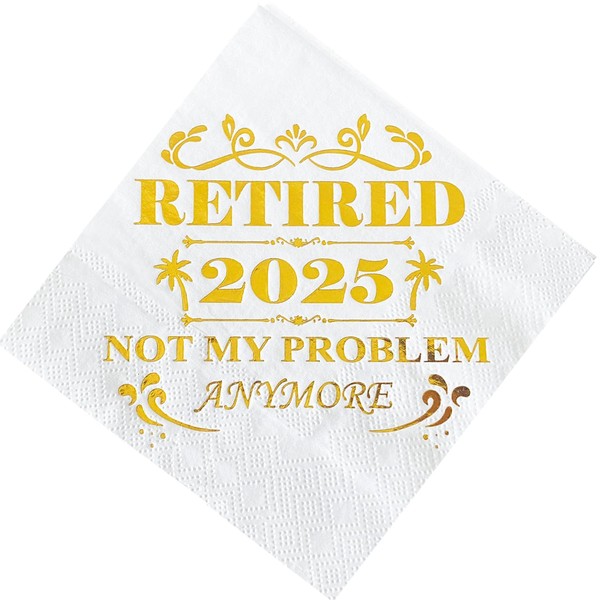 Retired 2025 Cocktail Napkins, 50 Pack 3-Ply Retirement Party Decorations Supplies, White & Gold Disposable Napkins for Farewell,Coworker Goodbye & Going Away Celebration (5"x5")