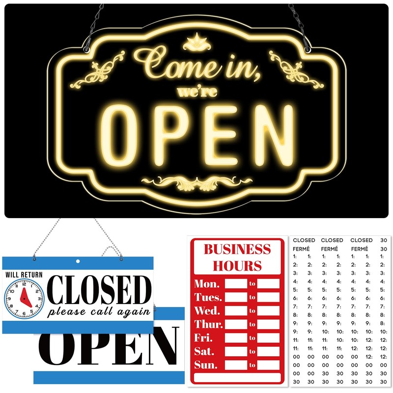 - Signage Package Included: the package includes one LED warm white neon business sign with a 59 inch USB power cord, two open and close signs fixed with a chain, and a business hour sign, offering a comprehensive signage solution for your business
