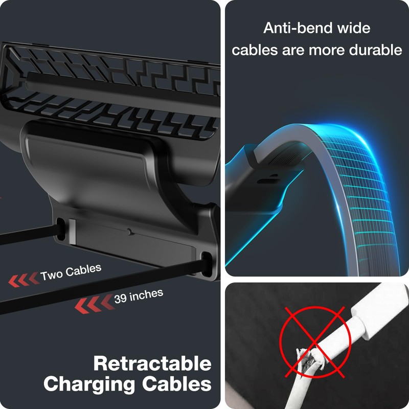 - Fast charging dock: The car fast charger comes with 30W and 60W charging cables. Featuring heavy-duty wide-gauge wiring for enhanced durability and power delivery, it allows rear-seat passengers to charge their phones and other devices quickly and safely.