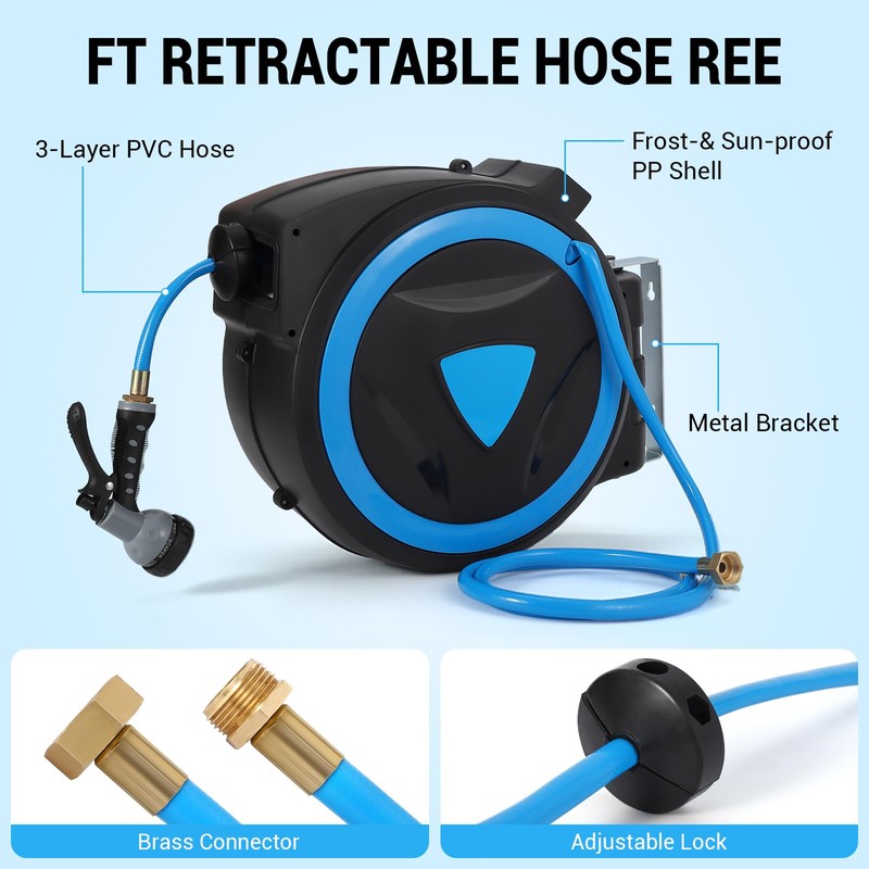 Retractable Garden Hose Reel 1/2 IN x 65 FT with 9-In-1 Nozzle - Compact Space-Saving Design, 220lb Wall Mount & Any Length Lock & 180° Swivels Base,Ideal for Patio, Balcony & Small Yards