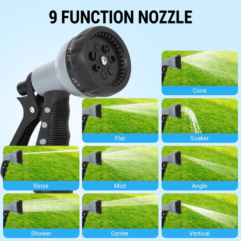- 2.【9-in-1 Smart Spray Modes】:Gentle for seedlings, Medium for flower beds, Turbos for patio cleaning – switch instantly between delicate watering and high-pressure washing. Includes rose-style shower head for hanging baskets.