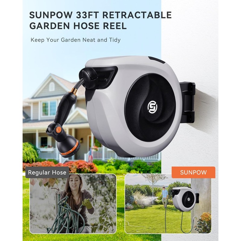 - 【Package Included】1x 33FT Hose Reel; 1 x Functional Spray Nozzle; 1 x Wall Mount; 4 x Bolts; 4 x Expansion Tubes; 1 x User Manual.