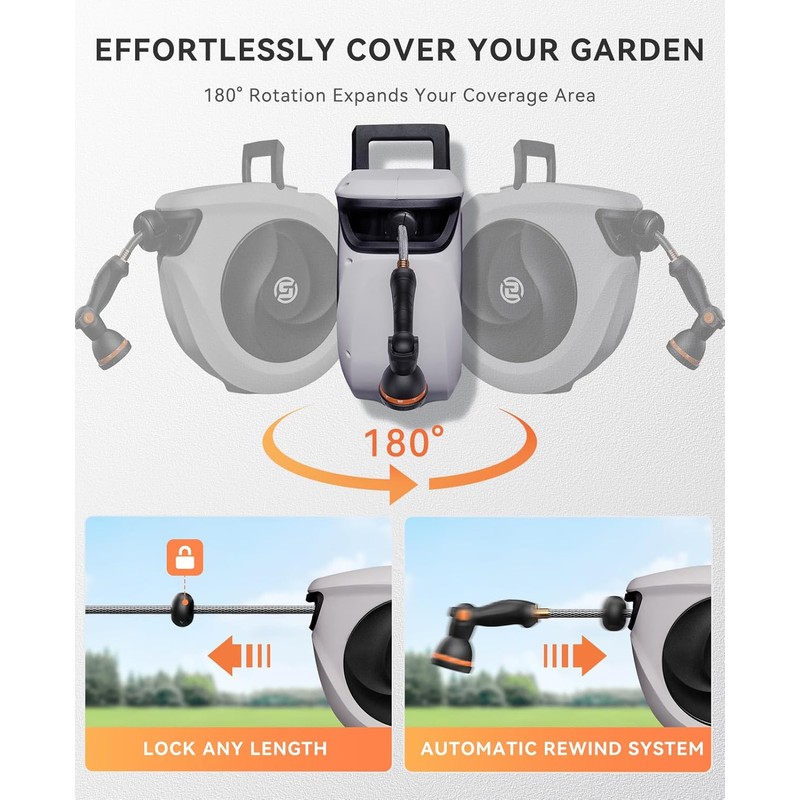 - 【180°Swivel Bracket for Flexible Coverage】The wall-mounted swivel bracket rotates 180,offering maximum flexibility to water all areas of your garden or workspace. Enjoy full coverage without repositioning the reel.