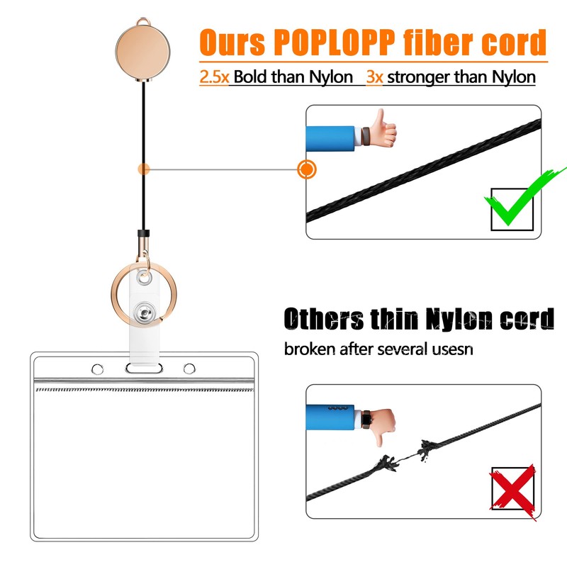 - 【Persistent Badge Reel & Key Ring】The badge reel and key ring is made of zinc alloy. will not fade or rust, nickel-free. The spring in the badge reel is made of stainless steel The retraction force is reliable, strong enough and strong enough to support most of the key's weight without slipping all the way . Built-in ultra-resistant fiber rope, 3x stronger than Nylon cord of generic badge reel so you never have to worry about them falling off