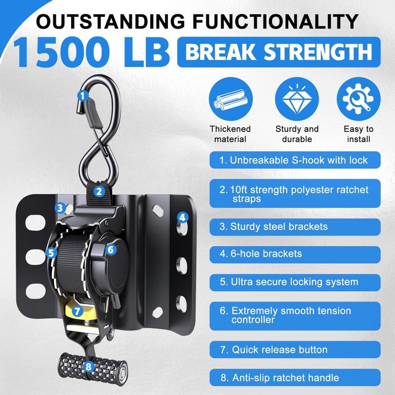 - Easy to Use and Install: Installation is straightforward with provided screws, also provide instructions, the quick-flip ratchet mechanism is easily loosened and tightened by simply pressing the yellow button, and pulling up the ratchet handle snaps the straps to keep them from sliding, allowing for quick and secure loading of items