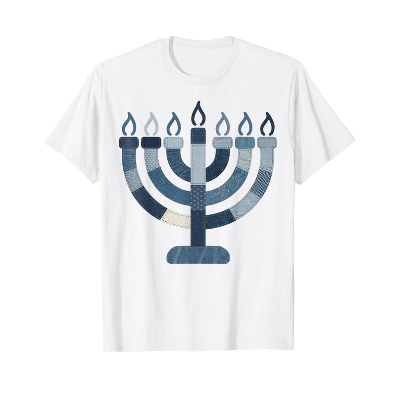 - Adorable Hanukkah Menorah Blue Denim Patchwork Perfect for cottagecore style fans celebrating the Jewish holiday. Enjoy this quilter style design with a touch of retro charm for cozy December vibes.