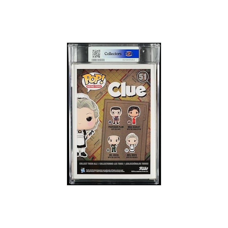 Retro Toys: Clue™ Mrs. White w/The Wrench™ Collectible Vinyl Figure #51, Fully Encapsulated Bundle with Compatible Funko™ Pop!™ PSA Hard Protector Case, PSA Graded 8.5 NM-MT+
