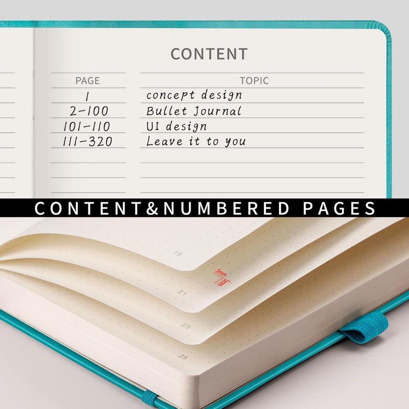 - Humanized Design: ❶ Numbered pages, Journal Stencil, Index Content pages, 2 Bookmarks for easy navigation. ❷ Inner pocket holds notes, business cards, and small gadgets. ❸ Elastic band closure and pen holder loop for convenience.