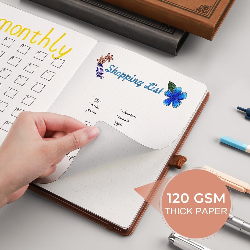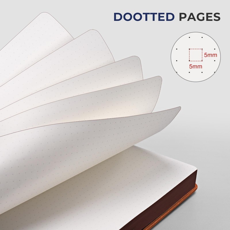 - 320-Page Dotted Notebook: With 5 x 5mm dot grid paper, this 160 sheets/320 pages notebook serves as a sanctuary to encapsulate the boundless stream of your ephemeral musings. Moreover, the tasteful brown coating delicately graces the periphery, bestowing upon this notebook an exquisite allure.