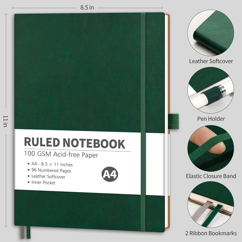 RETTACY Lined Journal Notebook, 8.5'' × 11'', Large Size, A4 College Ruled Notebook Journal for Writing, Work, School, Leather Softcover, 100 GSM Thick Paper, Numbered Pages (Dark Green)