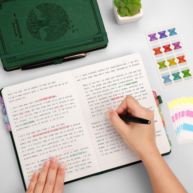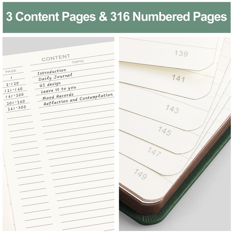 - Complementary design: ❶ Page numbers, separated sticky notes, 2 bookmarks to help you find important content faster; ❷ High-quality PU leather hard cover, perfect to protect the inner pages from folding and injuries, etc. ❸ Expandable inner pocket on the back to hold sticky notes, business cards, small notes, etc.; ❹ Elasticated straps on the back to better hold the cover in place, and an elasticated pen holder loop to hold a pen.