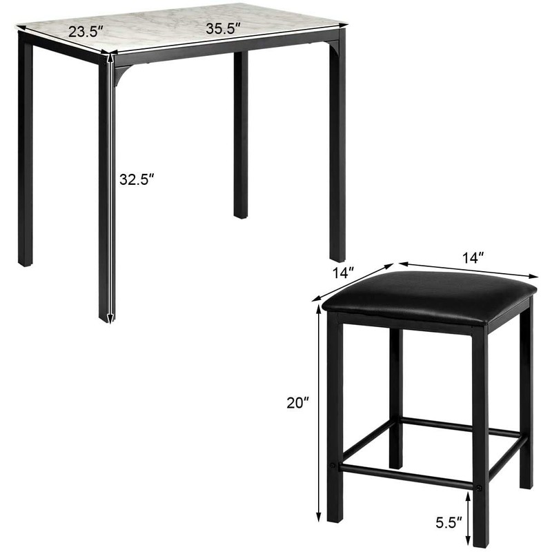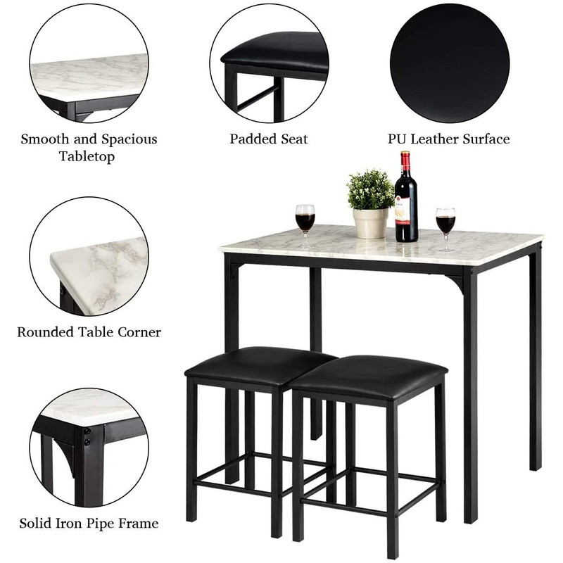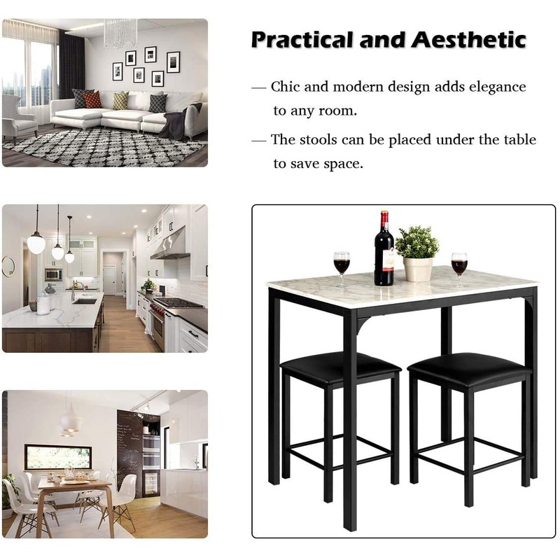 - 【Sturdy Table Frame & Comfortable Chairs】: Black iron frame and legs provide stability during use, MDF and top topped with marble-style PVC ensure years of sturdy use.The iron feet of the stool are strong enough to support anyone, the cushion of the stool is filled with sponge and the outer cover is PU leather for a cool and comfortable seating experience.