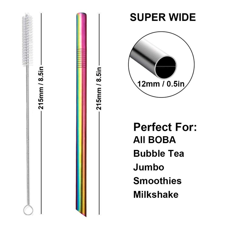 - Metal Straws Extra Wide, Washable 304 Stainless Steel Reusable Personal Metal Straw, Stand Against Scratch, Rust and Crash. 1/2, 0.5 inch Inner Diameter, Wide Enough for All Drinks. Good Partner for Fruit Juice, Lemonade, Milkshake, Smoothie, Jumbo Bubble Boba Tea, Cola, Cocktail, Soft Drinks and so on.