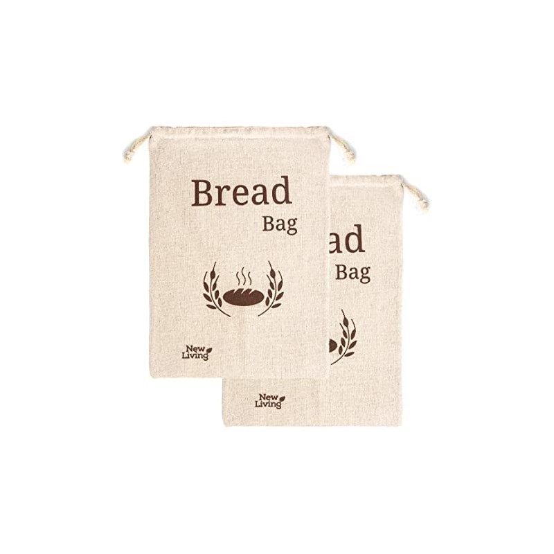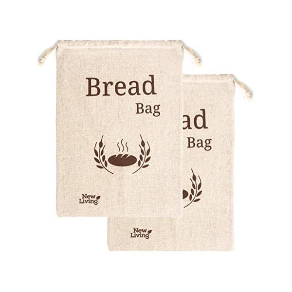 - Product – New Living bread bags 2 pieces, size: 38 x 27 cm, blend of linen and natural cotton with easy to close drawstring, no plastic in the material. The perfect warm design will look great on any kitchen counter.