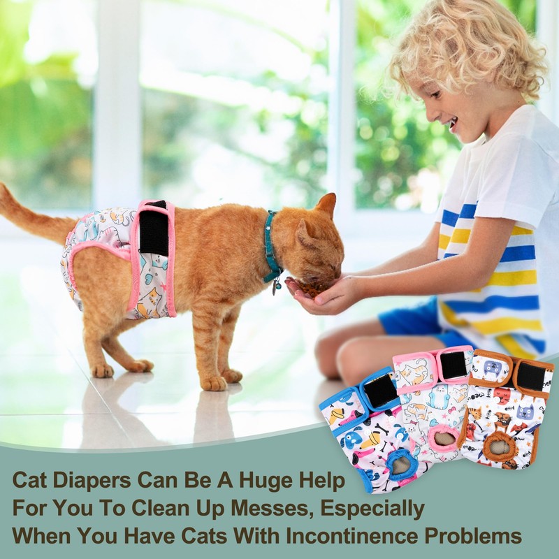 - Reusable and Adorable - There are 3 cat diapers in a pack, so you can be sure your cat always has clean diapers to wear. And these kitty diapers are reusable, just wash and dry them and use them again, now you can save a lot of money on those disposable diapers. These three diapers come in three different patterns, your cat will love these and your mood will change when you see your cute cat in these adorable cat diapers for female cats!