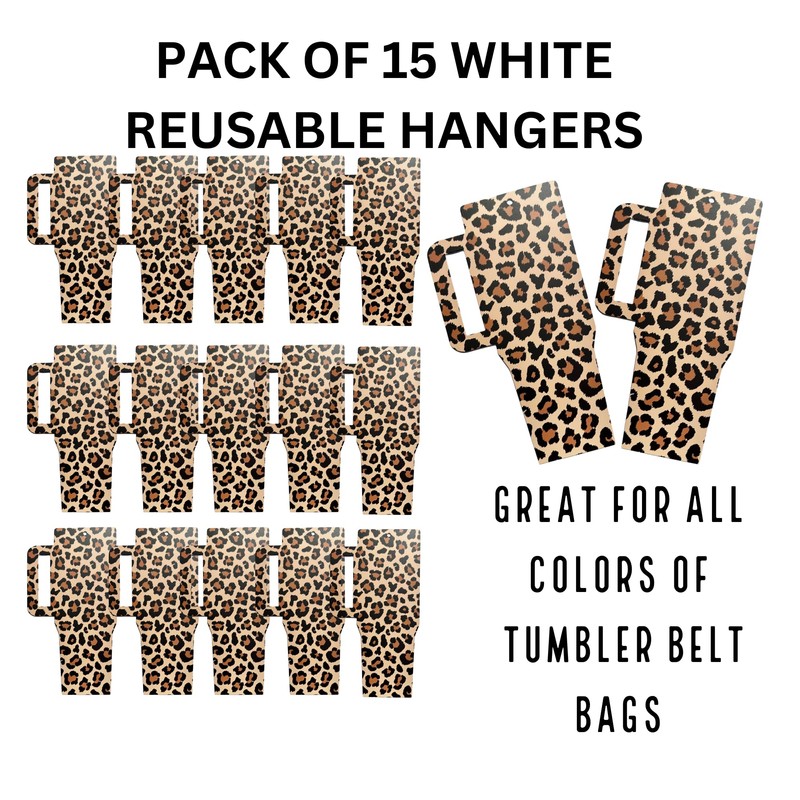 In the business of selling tumbler belt bags or accessories for 40 oz tumblers, presentation matters, and our 15-Pack of Leopard Print Reusable Cardstock Hangers is here to make a statement. Crafted with boutique owners and small business entrepreneurs in mind, these cardstock display hangers offer a stylish solution to your retail display needs.