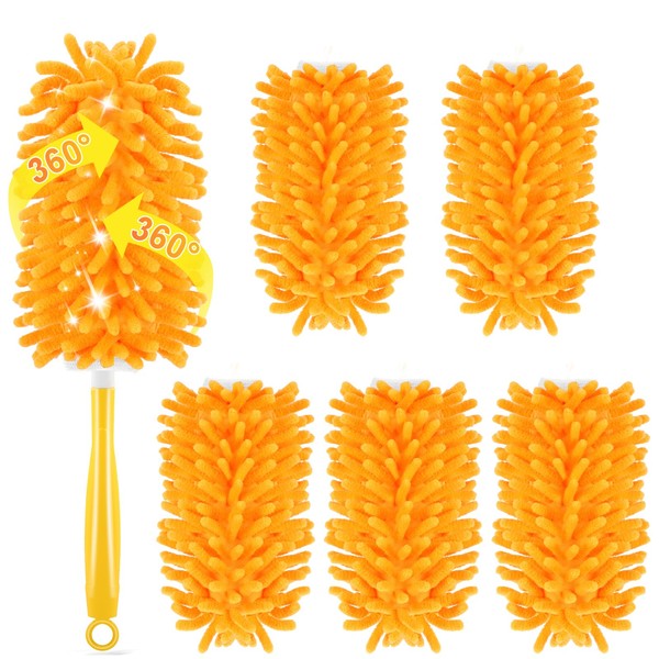 Reusable Duster Refill for Swiffer Duster Refill, 360° Heavy Duty Duster Refills Kit, 5 Pack with 1 Handle Microfiber Ceiling Fan Dusters for Cleaning(Orange, 5PCS)