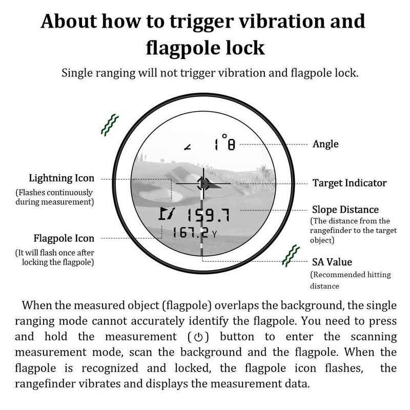 - [Slope On & Pin Lock Vibration]-When the Pin overlaps with the background, press and hold the measurement button to start scanning. When recognized the flag, it will lock the measurement data and trigger a vibration to remind. In slope-on mode, angle, sight of line distance and golf compensation distance are displayed.