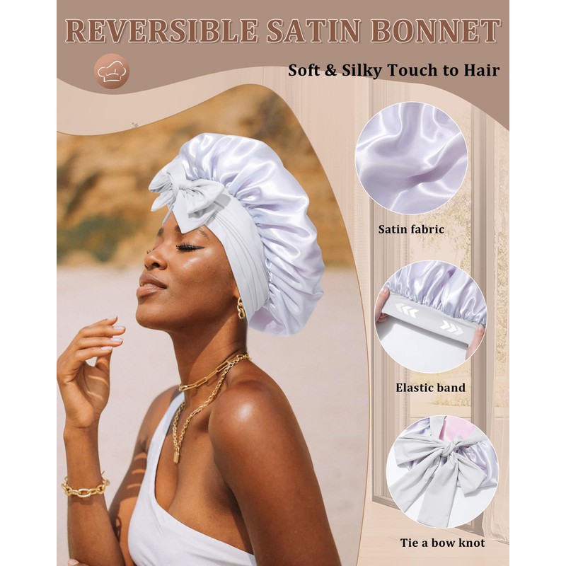 Reversible Satin Bonnet for Sleeping Women Double Layer Hair Bonnet with 2PCS Hair Scrunchies Elastic Tie Band(Light silver+Pink)