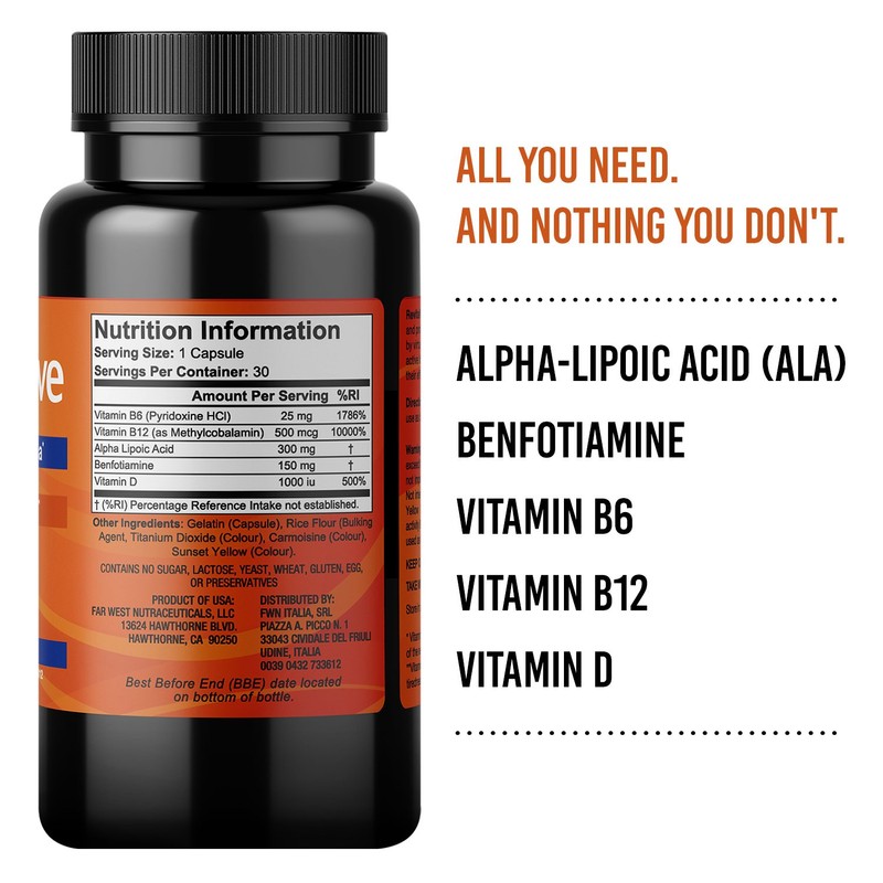 - Contains all 4 ingredients clinically proven to improve neuropathy: Alpha-lipoic Acid (ALA), Benfotiamine, Vitamin B6, Vitamin B12, and Vitamin D