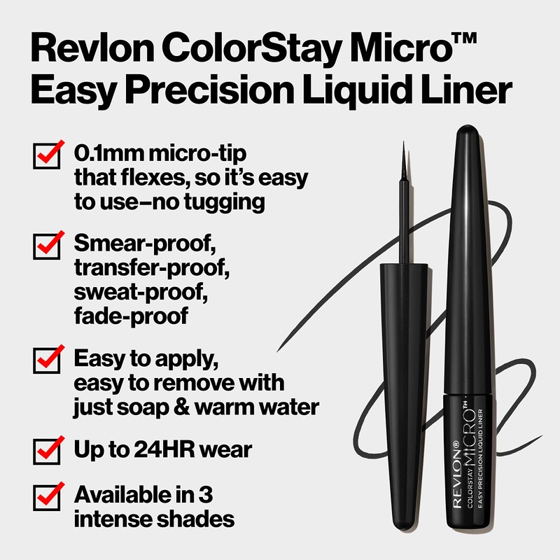 Create fine yet bold lines with Revlon ColorStay Micro? Easy Precision Liquid Liner. A hyper-precise 0.1mm micro-tip and a high-pigment, 24HR wear formula ensures precise and easy application. Whether it's natural definition or the latest liner trends youre after, this is your new go-to.