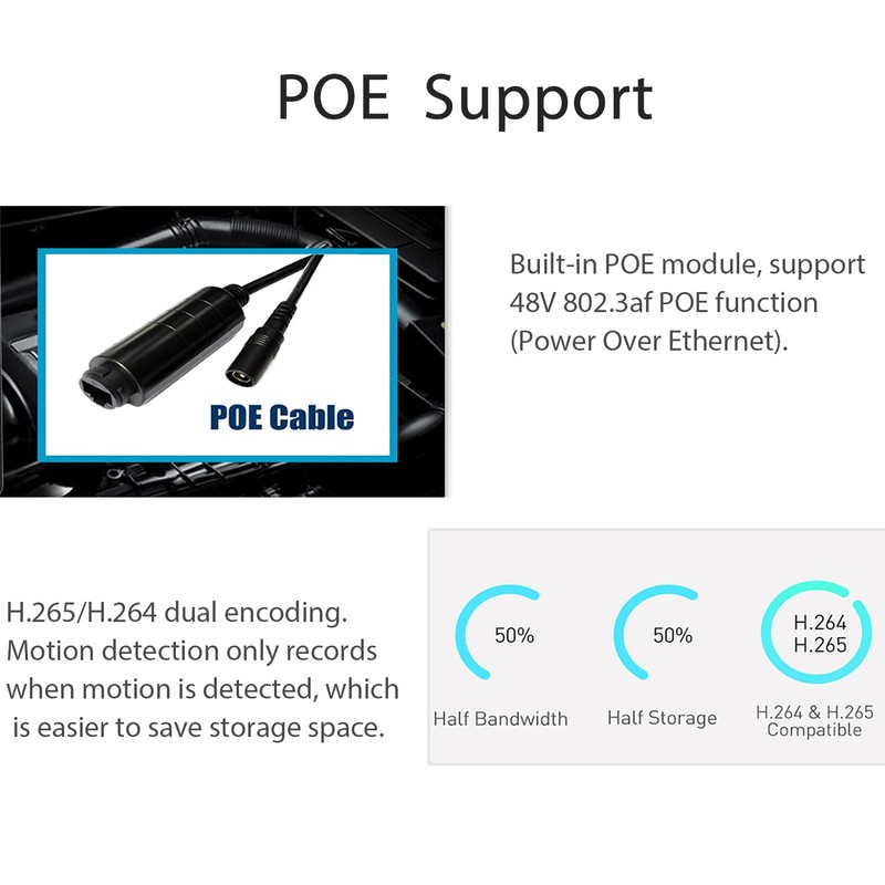 - 〖 Save Storage Space, H.265/H.264 double encoding 〗Compared with H.264, H.265 requires half the bandwidth to transmit the same image quality, and only half the storage space for the same recording quality. Motion detection only records when motion is detected, which is easier to save storage space than other cameras.