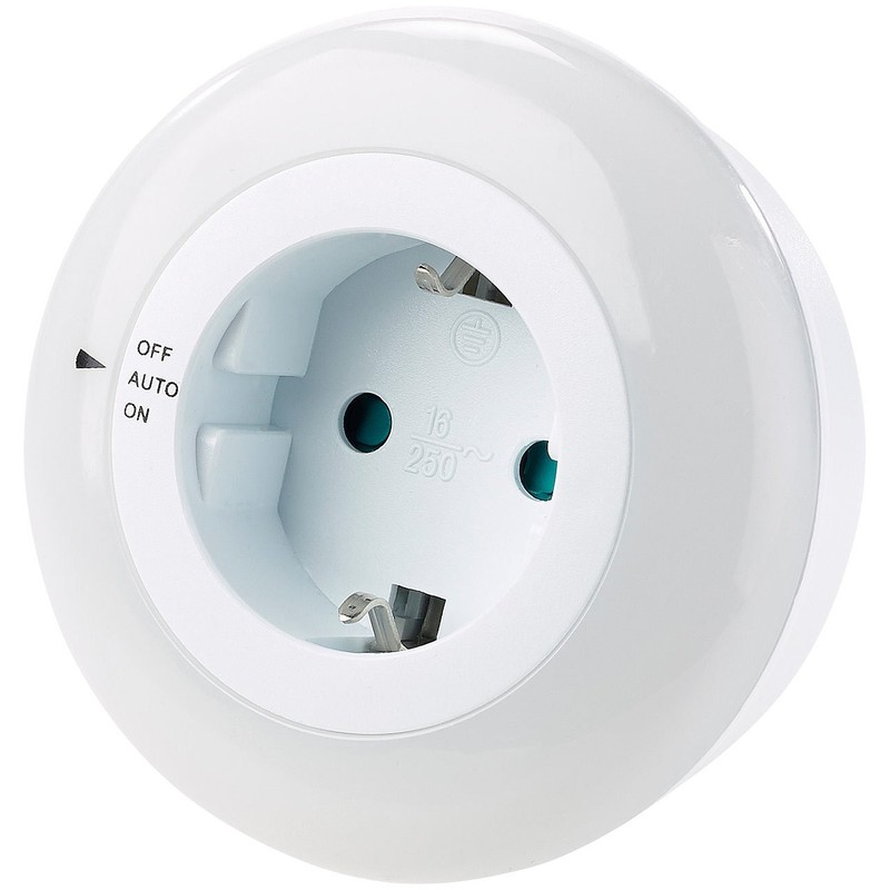 - Light for children's rooms, stairs, hallways etc. Twilight sensor for automatic light in the dark More safety thanks to better orientation Economical LED light in white Integrated socket with child lock