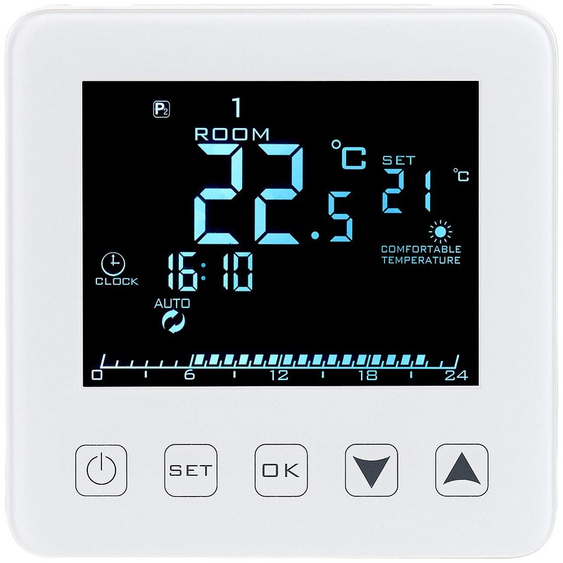 - Suitable for all electric underfloor heating. Automatic mode: the temperature is automatically adjusted depending on the day of the week and time. Individually programmable: up to 6 heating phases per day, 7 days a week. Temperature adjustable from 5 - 35 °C. Easy to use via 5 touch buttons. For inconspicuous flush-mounted mounting on the wall. Dimensions (without flush-mounted box): 85. x 85 x 13 mm, flush-mounted box: 48 x 48 x 25 mm, weight: 196 g