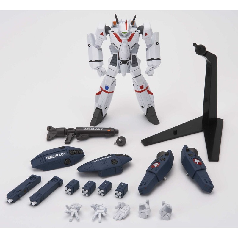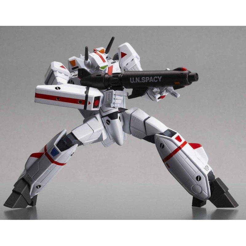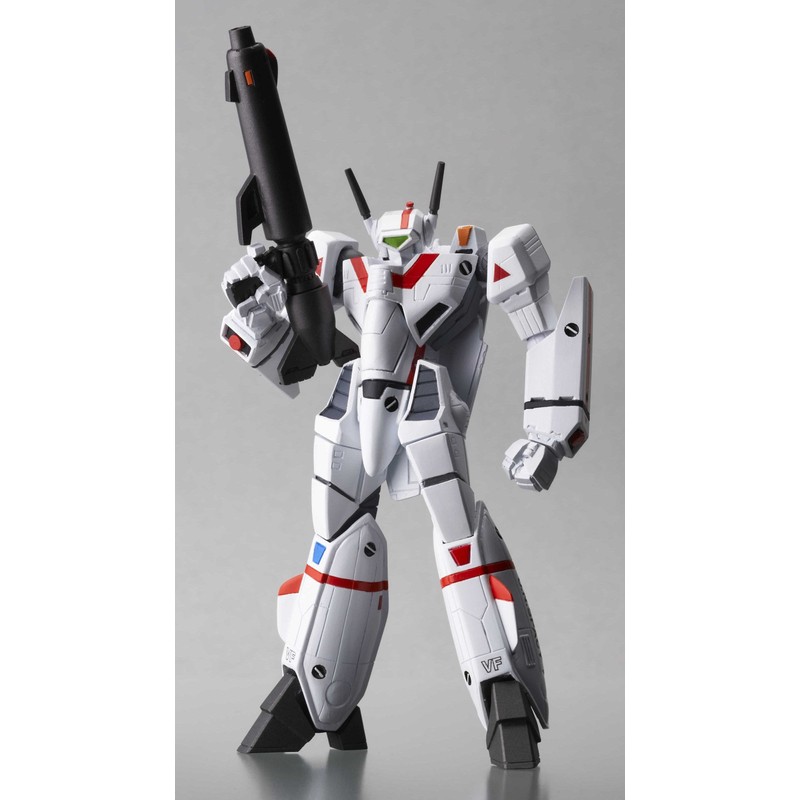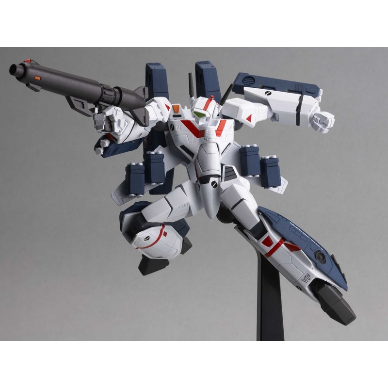 The Super Valkirye VF-1J Hikaru action figure is 6" tall and comes with a custom base for display. The figure also has fourteen articulation points and comes equipped with removable Super Armor, weapons and accessories for different poses.