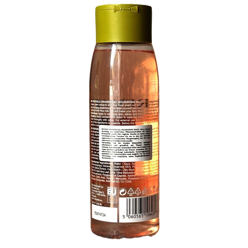 - REVUELE NOURISHING MAGIC SHOWER GEL For velvety soft, smooth skin with rice milk and rose fragrance.