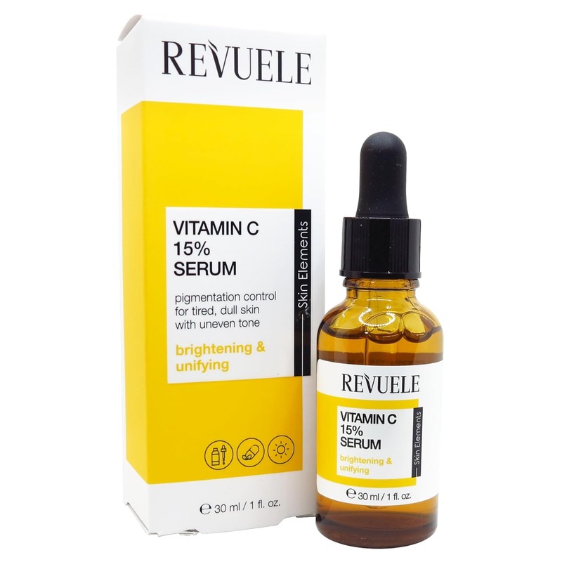 REVUELE SKIN ELEMENTS SUERO VITAMINA C 15 % es un potente producto antioxidante que aborda eficazmente una serie de problemas del cuidado de la piel, como la opacidad, la pigmentación, la decoloración, así como la textura desigual y las líneas finas. Aumenta la producción de colágeno para promover la firmeza y ralentizar la formación de arrugas. Utilizado regularmente, el suero transforma visiblemente la piel para minimizar las marcas de hiperpigmentación y mejorar la claridad general y el brillo de la tez. La Vitamina C es el antioxidante favorito de todos los tiempos de los dermatólogos y esteticistas. Se ha demostrado que es eficaz incluso cuando se aplica tópicamente, lo que lo convierte en un ingrediente esencial para el cuidado de la piel para lograr una piel más luminosa, fresca y de aspecto más joven. Conocida también por su poder para potenciar la acción de los productos de protección solar, la vitamina C sin duda ayuda a la piel de múltiples maneras: desde protegerla de factores agresivos externos hasta potenciar la claridad y luminosidad de la piel desde dentro y ayudar a frenar el fotoenvejecimiento. . Beneficiosa para todo tipo de piel y apta para uso frecuente, la nueva gama REVUELE VITAMINA C proporciona la rutina de cuidado de la piel iluminadora definitiva que transformará la piel para lograr el brillo saludable más deseado