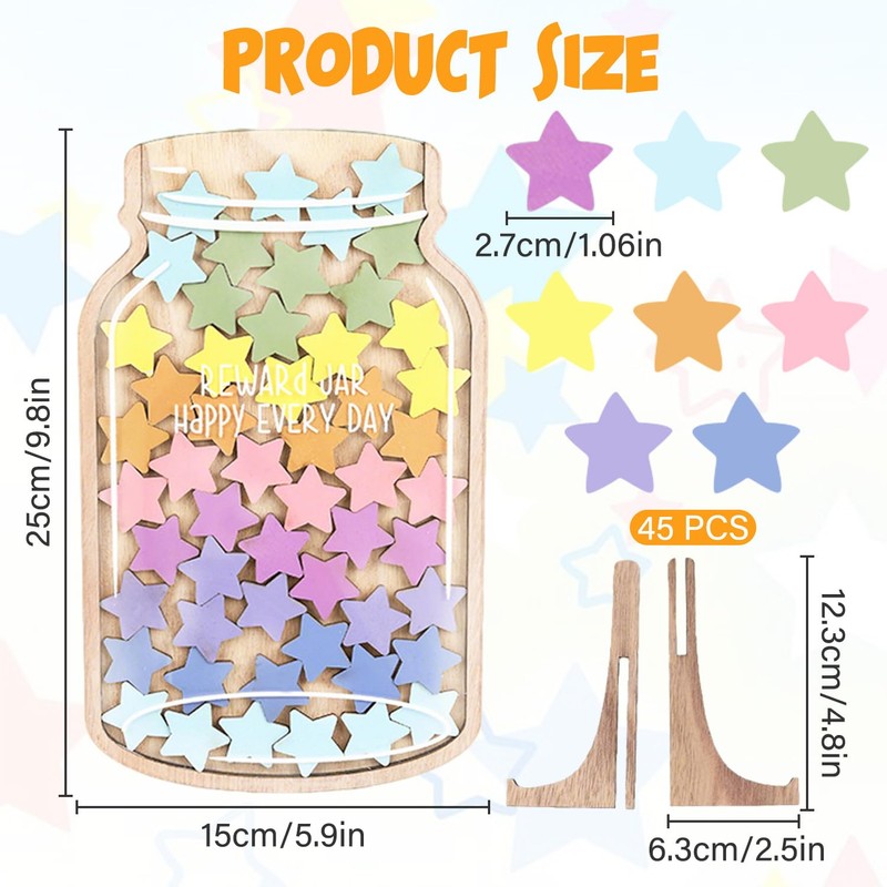 • 【Perfect Size】You will receive 1 wooden star chart for children behaviour, 45 colorful stars, which includs 9 colors and a wooden stand for tabletop display. Star reward jar measures about 15cmx25cm/5.9"x9.8", which is small, lightweight and portable.