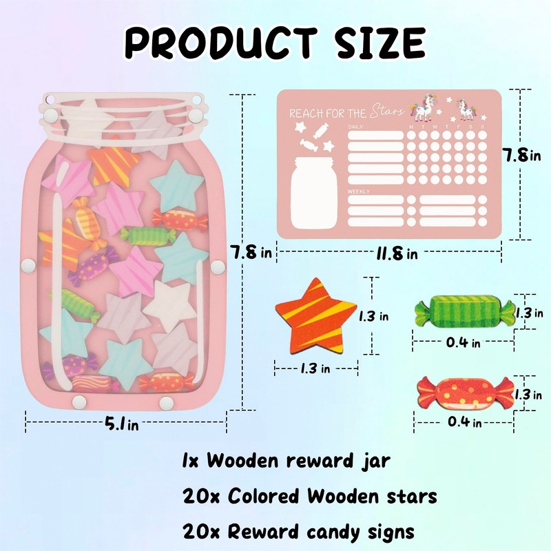 - STAR JAR: You will receive 1 piece wooden reward jar with a strong magnet containing 20 colorful wooden stars and 20 colorful wooden candies. A solid rope for hanging, and 1 piece wooden stand for table display, 1 piece erasable marker and 1 piece rainbow dry erase whiteboard reward chart