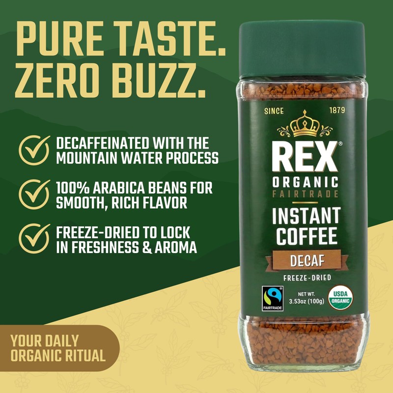 Rex Organic Fairtrade Decaf Freeze-Dried Instant Coffee – Naturally Decaffeinated Arabica, 3.53 oz Glass Jar – Mountain Water Process
