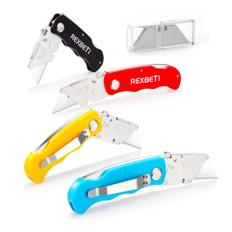 REXBETI 4-Pack Folding Pocket Utility Knife Quick-change SK5 Box Cutter for Cartons, Cardboard and Boxes, Back-lock Mechanism with 10 Extra Blades
