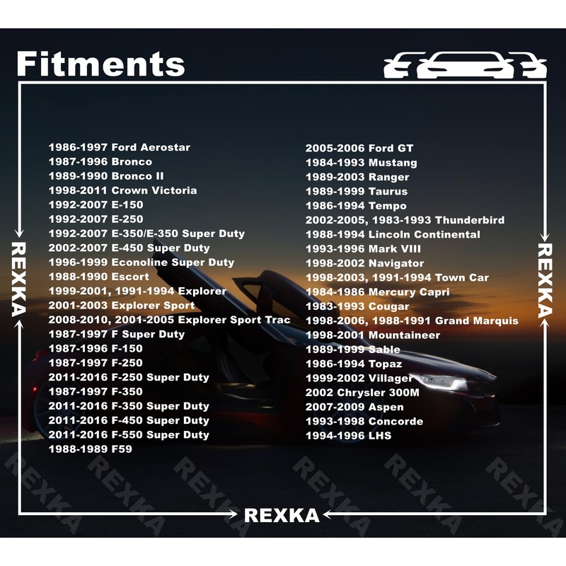 - Fits Ford: Aerostar, Bronco, Bronco II, Crown Victoria, E-150, E-250, E-350/E-350 Super Duty, E-450 Super Duty, Econoline Super Duty, Escort, Explorer, Explorer Sport, Explorer Sport Trac, F Super Duty, F-150, F-250 F-250 Super Duty, F-350, F-350 Super Duty, F-450 Super Duty, F-550 Super Duty, F59, GT, Mustang, Ranger, Taurus, Tempo, Thunderbird; Lincoln: Continental, Mark VIII, Navigator, Town Car; Mercury: Capri, Cougar, Grand Marquis Mountaineer,Sable Top