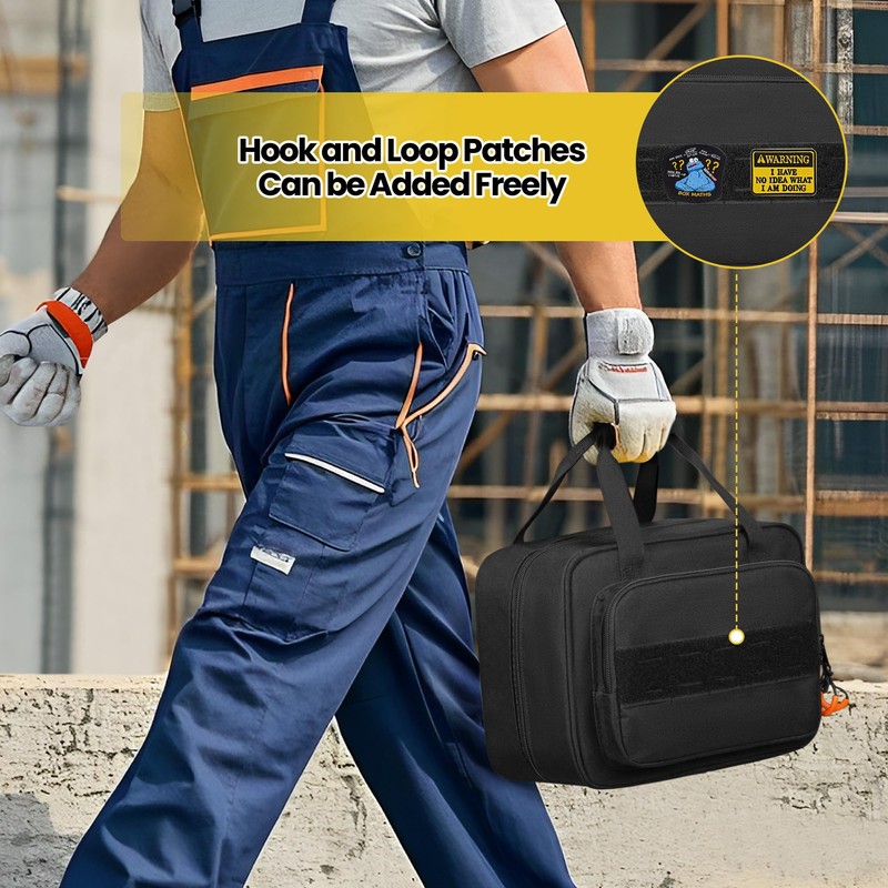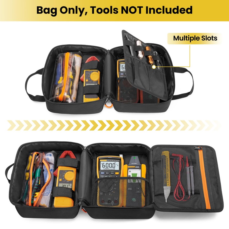 - LARGE CAPACITY: Main compartment with a clear pocket, mesh pocket and a pair of elastic loops for organizing digital multimeter, clamp multimeter, socket tester, voltage tester, etc. 1 additional extendable flap with mesh zip pocket and multiple slots for small tool and replacement test lead.