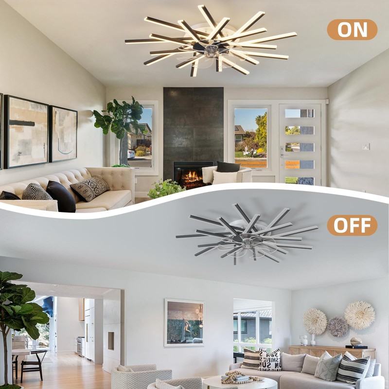 - Creative Design: Unique modern solar strip ceiling lamp design, with creative fans, makes the whole room full of natural light, and warmth and comfort can be seen everywhere. Energy saving, stability and long service life. Can be used for lighting and room decoration. Material: Acrylic screen adopts transparent and nanotechnology, which ensures that it is not a dark area with light transmission, and has good density and uniformity.
