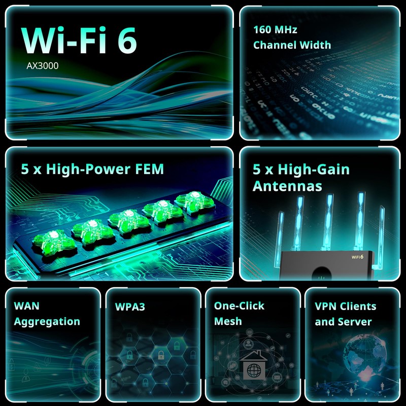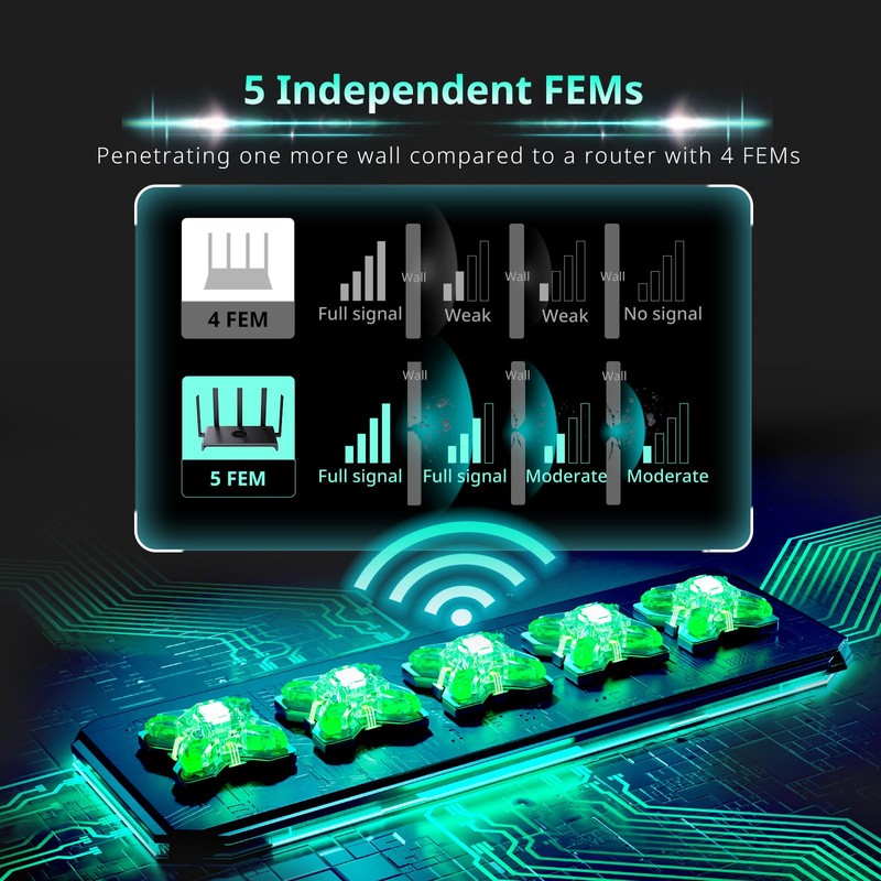 - Better Signal: Boasting five omnidirectional antennas and five high-power FEMs, this router provides a stronger Wi-Fi signal that can penetrate through one more wall, ensuring reliable connectivity even in houses with complex layouts and diverse room types. (Coverage can reach up to 3000 square feet.)